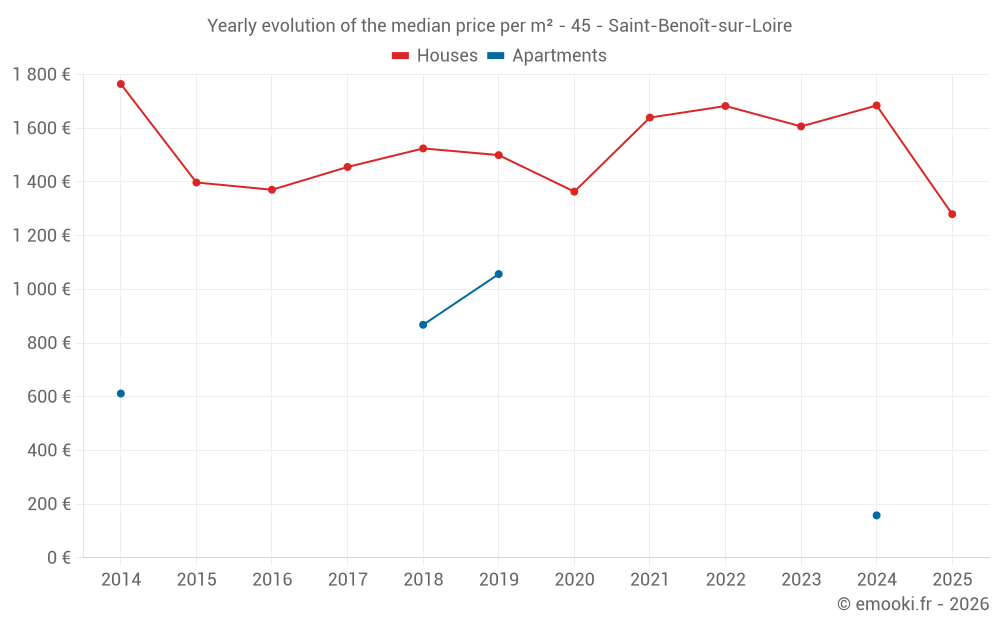 The median price on the 27 house transactions of the last 12 months in the municipality of Saint-Benoît-sur-Loire was 1 421 € per square meter for a median property value of 195 000 €. Over this period, 60% of transactions were between 1 069 and 2 458 € per square meter (from the 2nd to the 8th deciles).