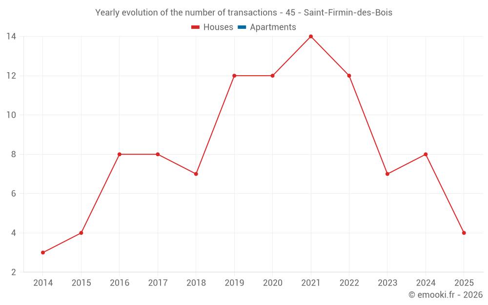 The median price on the 17 house transactions of the last 24 months in the municipality of Saint-Firmin-des-Bois was 1 270 € per square meter for a median property value of 105 000 €. Over this period, 60% of transactions were between 847 and 1 610 € per square meter (from the 2nd to the 8th deciles).
