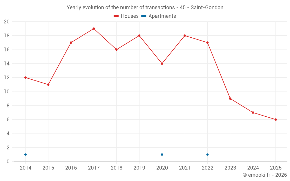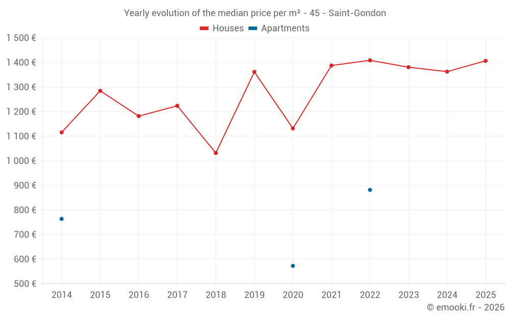The median price on the 17 house transactions of the last 24 months in the municipality of Saint-Gondon was 1 363 € per square meter for a median property value of 127 000 €. Over this period, 60% of transactions were between 804 and 1 576 € per square meter (from the 2nd to the 8th deciles).