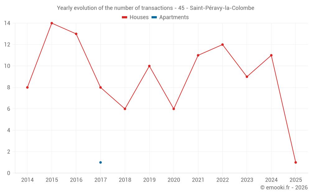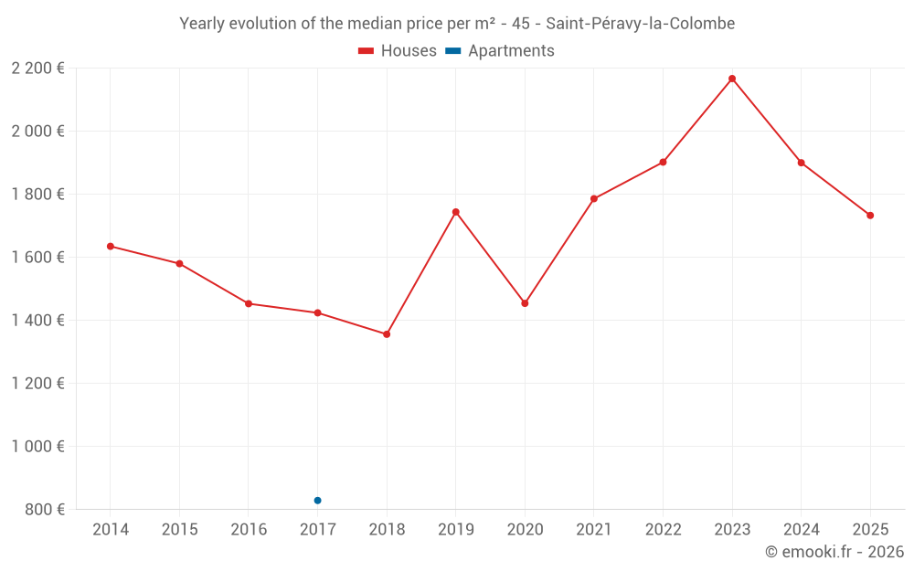 The median price on the 16 house transactions of the last 24 months in the municipality of Saint-Péravy-la-Colombe was 1 998 € per square meter for a median property value of 173 000 €. Over this period, 60% of transactions were between 1 293 and 2 236 € per square meter (from the 2nd to the 8th deciles).
