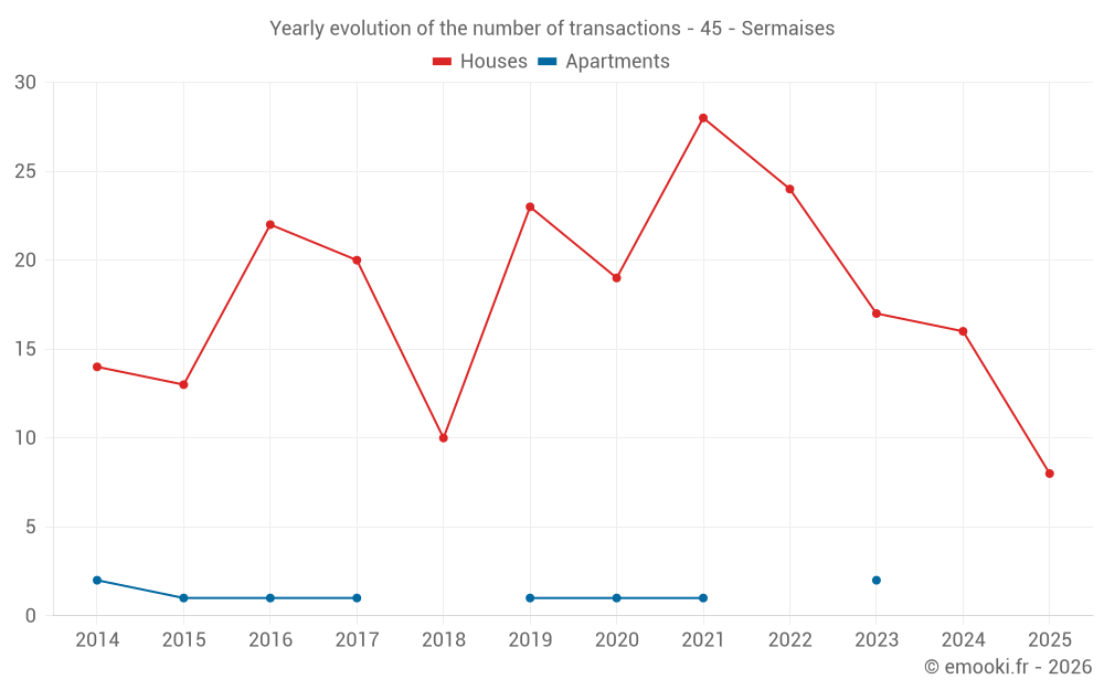 The median price on the 19 house transactions of the last 12 months in the municipality of Sermaises was 1 846 € per square meter for a median property value of 182 000 €. Over this period, 60% of transactions were between 1 341 and 2 190 € per square meter (from the 2nd to the 8th deciles).