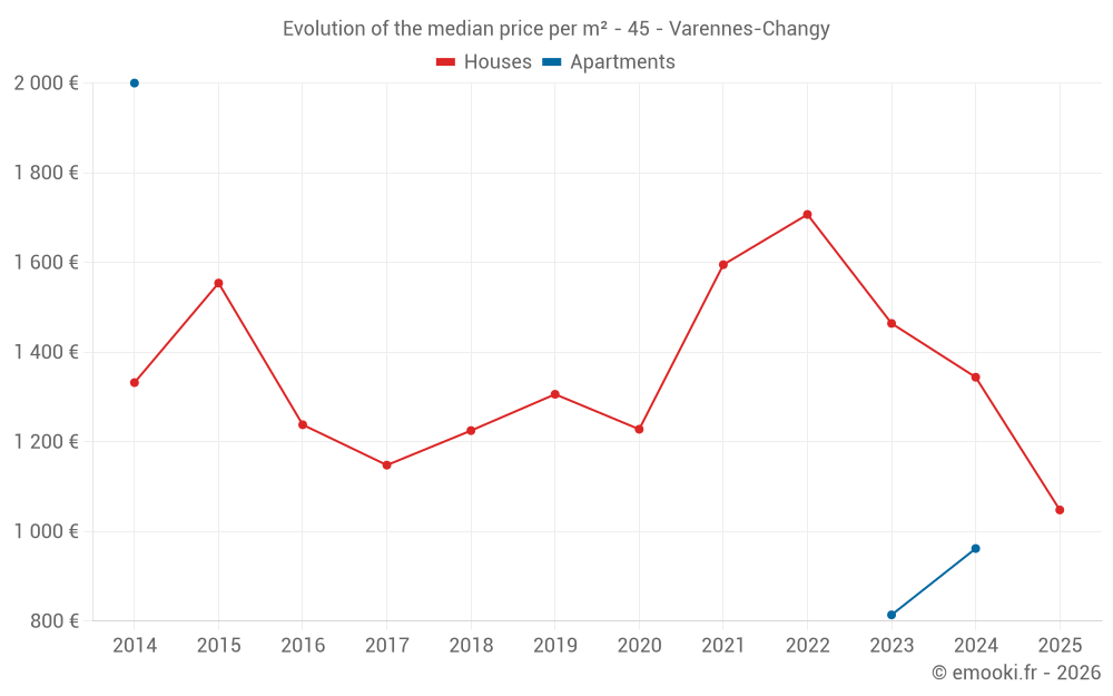 The median price on the 40 house transactions of the last 24 months in the municipality of Varennes-Changy was 1 430 € per square meter for a median property value of 125 000 €. Over this period, 60% of transactions were between 976 and 1 993 € per square meter (from the 2nd to the 8th deciles).