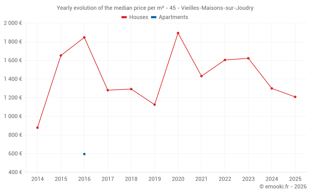 The median price on the 14 house transactions of the last 24 months in the municipality of Vieilles-Maisons-sur-Joudry was 1 166 € per square meter for a median property value of 127 500 €. Over this period, 60% of transactions were between 949 and 1 560 € per square meter (from the 2nd to the 8th deciles).