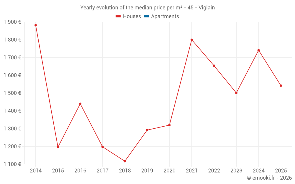 The median price on the 23 house transactions of the last 24 months in the municipality of Viglain was 1 544 € per square meter for a median property value of 128 000 €. Over this period, 60% of transactions were between 1 242 and 2 120 € per square meter (from the 2nd to the 8th deciles).
