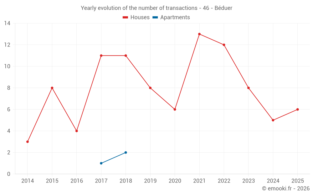 The median price on the 17 house transactions of the last 24 months in the municipality of Béduer was 1 852 € per square meter for a median property value of 145 000 €. Over this period, 60% of transactions were between 1 197 and 2 291 € per square meter (from the 2nd to the 8th deciles).