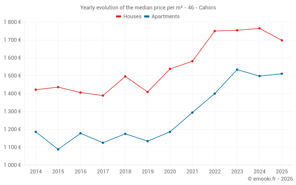 The median price on the 34 house transactions of the last 3 months in the municipality of Cahors was 1 651 € per square meter for a median property value of 149 425 €. Over this period, 60% of transactions were between 1 309 and 2 358 € per square meter (from the 2nd to the 8th deciles).