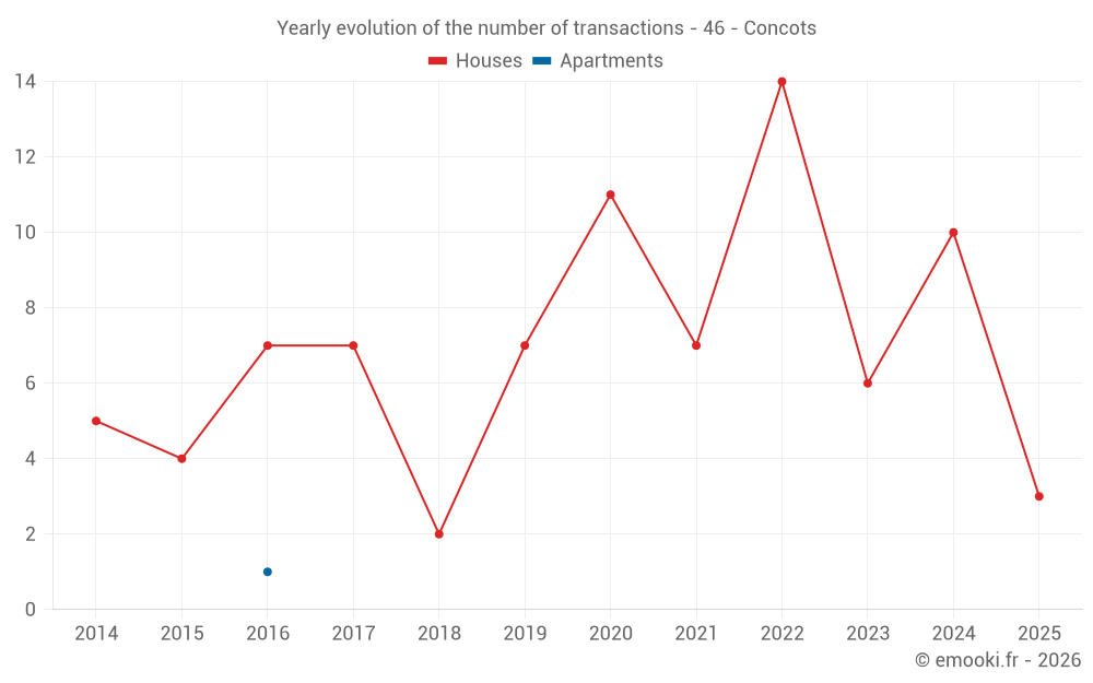 The median price on the 16 house transactions of the last 24 months in the municipality of Concots was 1 326 € per square meter for a median property value of 110 385 €. Over this period, 60% of transactions were between 961 and 1 794 € per square meter (from the 2nd to the 8th deciles).