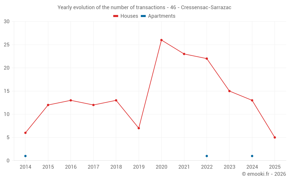 The median price on the 27 house transactions of the last 24 months in the municipality of Cressensac-Sarrazac was 1 533 € per square meter for a median property value of 142 900 €. Over this period, 60% of transactions were between 1 191 and 2 077 € per square meter (from the 2nd to the 8th deciles).