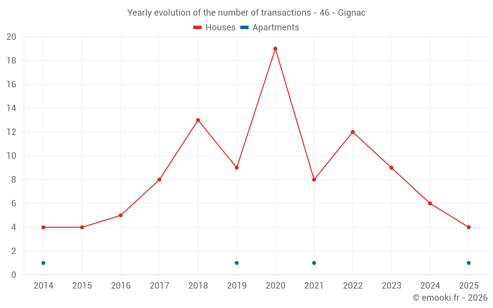 The median price on the 16 house transactions of the last 24 months in the municipality of Gignac was 1 690 € per square meter for a median property value of 250 800 €. Over this period, 60% of transactions were between 1 222 and 2 138 € per square meter (from the 2nd to the 8th deciles).