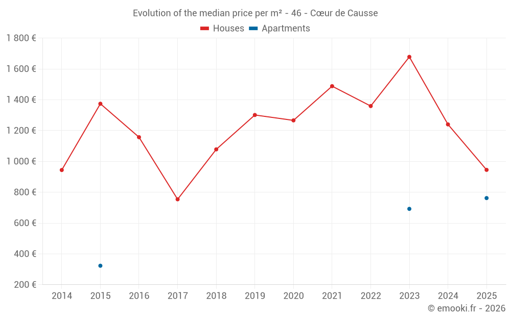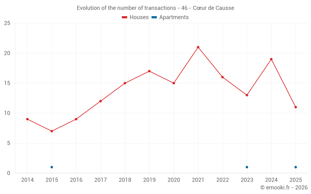 The median price on the 21 house transactions of the last 12 months in the municipality of Cœur de Causse was 1 240 € per square meter for a median property value of 149 250 €. Over this period, 60% of transactions were between 735 and 1 950 € per square meter (from the 2nd to the 8th deciles).