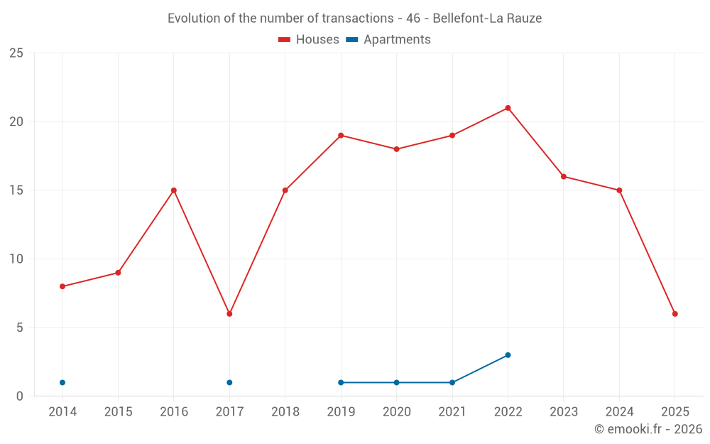 The median price on the 24 house transactions of the last 24 months in the municipality of Bellefont-La Rauze was 1 590 € per square meter for a median property value of 113 010 €. Over this period, 60% of transactions were between 504 and 1 896 € per square meter (from the 2nd to the 8th deciles).
