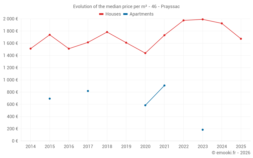 The median price on the 35 house transactions of the last 12 months in the municipality of Prayssac was 1 792 € per square meter for a median property value of 153 000 €. Over this period, 60% of transactions were between 1 056 and 2 444 € per square meter (from the 2nd to the 8th deciles).