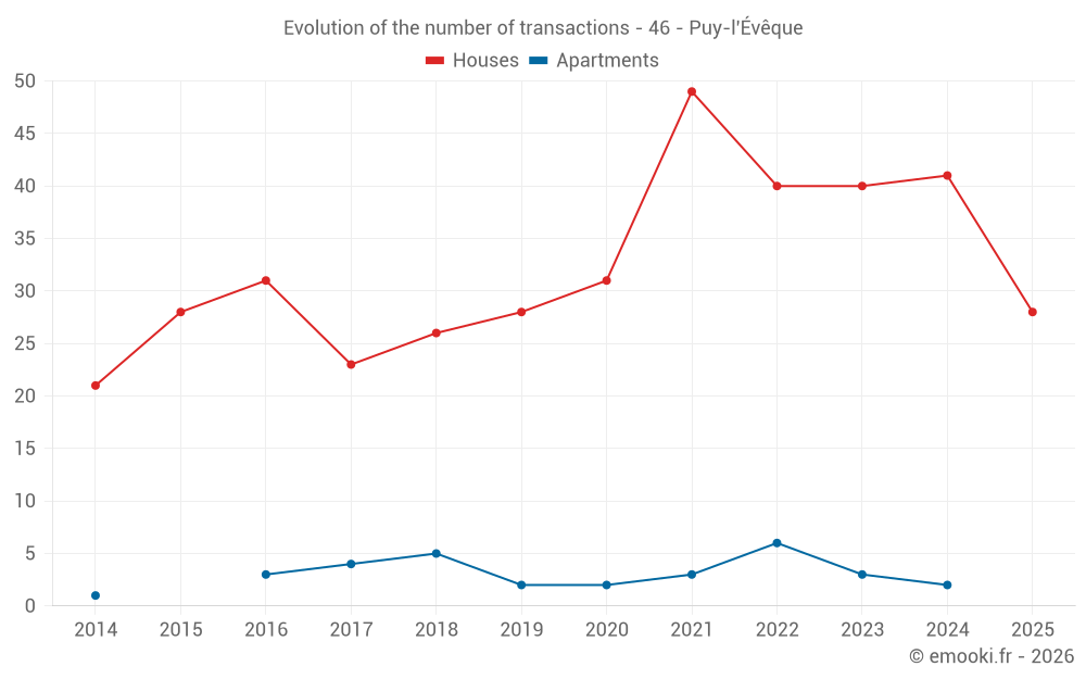 The median price on the 28 house transactions of the last 6 months in the municipality of Puy-l'Évêque was 1 670 € per square meter for a median property value of 149 000 €. Over this period, 60% of transactions were between 1 158 and 2 154 € per square meter (from the 2nd to the 8th deciles).