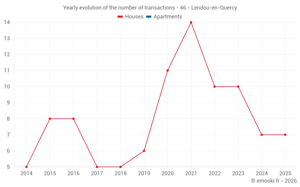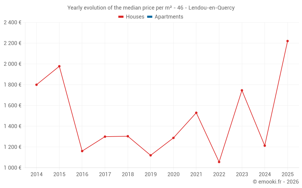 The median price on the 14 house transactions of the last 24 months in the municipality of Lendou-en-Quercy was 2 158 € per square meter for a median property value of 209 264 €. Over this period, 60% of transactions were between 1 017 and 3 278 € per square meter (from the 2nd to the 8th deciles).