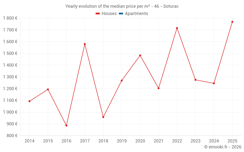 The median price on the 15 house transactions of the last 24 months in the municipality of Soturac was 1 245 € per square meter for a median property value of 203 580 €. Over this period, 60% of transactions were between 593 and 2 621 € per square meter (from the 2nd to the 8th deciles).