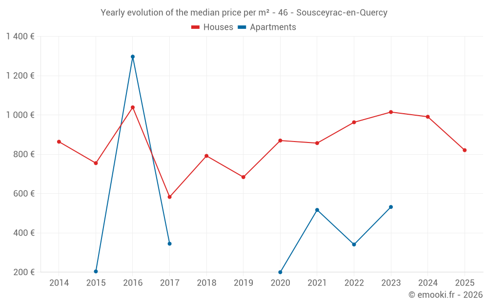 The median price on the 20 house transactions of the last 12 months in the municipality of Sousceyrac-en-Quercy was 847 € per square meter for a median property value of 106 500 €. Over this period, 60% of transactions were between 327 and 1 695 € per square meter (from the 2nd to the 8th deciles).