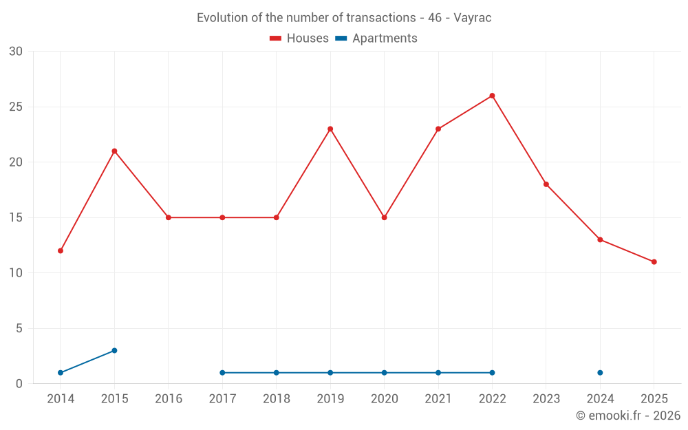 The median price on the 18 house transactions of the last 12 months in the municipality of Vayrac was 1 222 € per square meter for a median property value of 90 000 €. Over this period, 60% of transactions were between 735 and 1 491 € per square meter (from the 2nd to the 8th deciles).