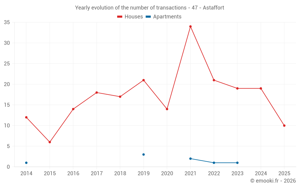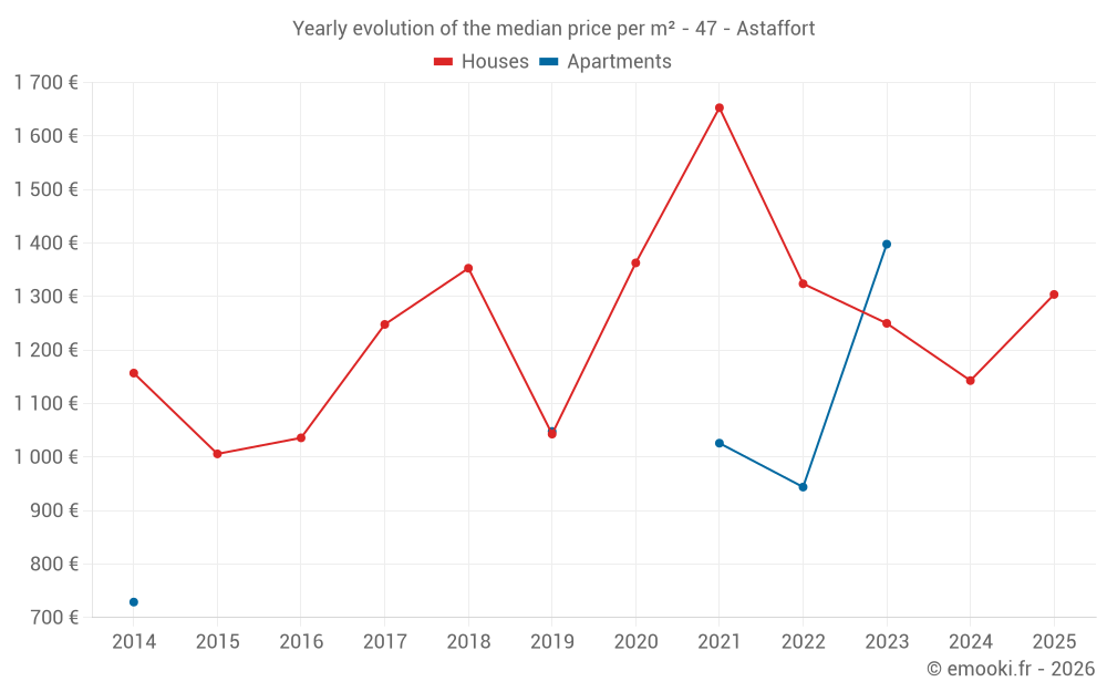 The median price on the 20 house transactions of the last 12 months in the municipality of Astaffort was 1 290 € per square meter for a median property value of 125 000 €. Over this period, 60% of transactions were between 878 and 1 951 € per square meter (from the 2nd to the 8th deciles).
