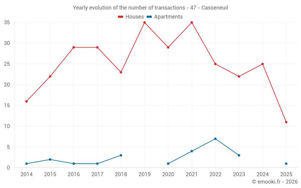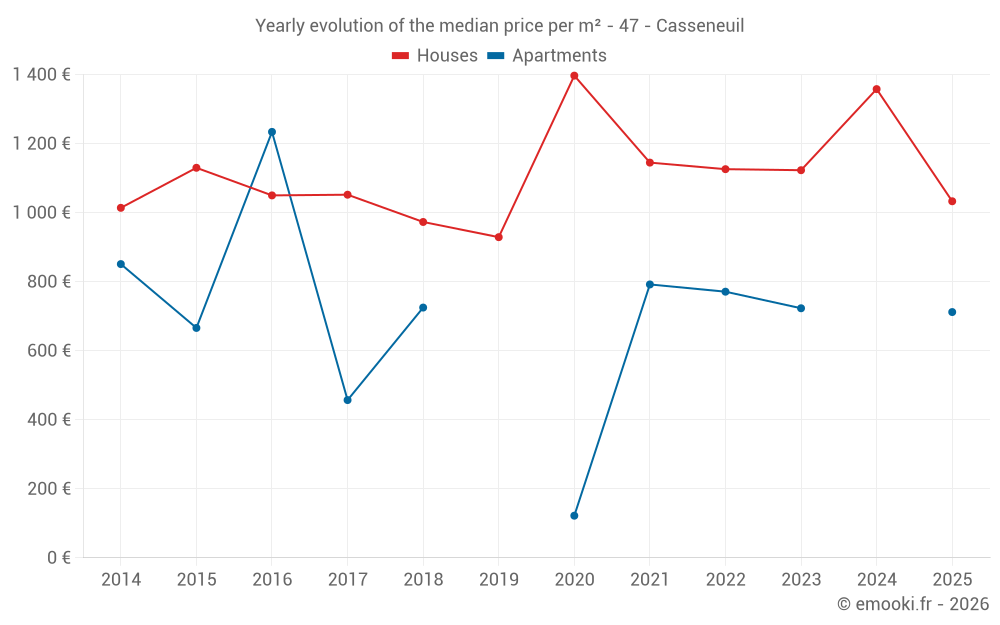 The median price on the 30 house transactions of the last 12 months in the municipality of Casseneuil was 1 136 € per square meter for a median property value of 119 650 €. Over this period, 60% of transactions were between 705 and 1 714 € per square meter (from the 2nd to the 8th deciles).
