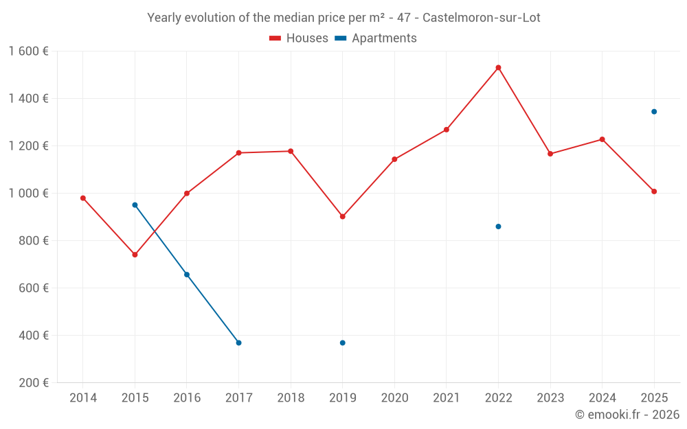 The median price on the 20 house transactions of the last 12 months in the municipality of Castelmoron-sur-Lot was 1 128 € per square meter for a median property value of 119 950 €. Over this period, 60% of transactions were between 484 and 1 372 € per square meter (from the 2nd to the 8th deciles).