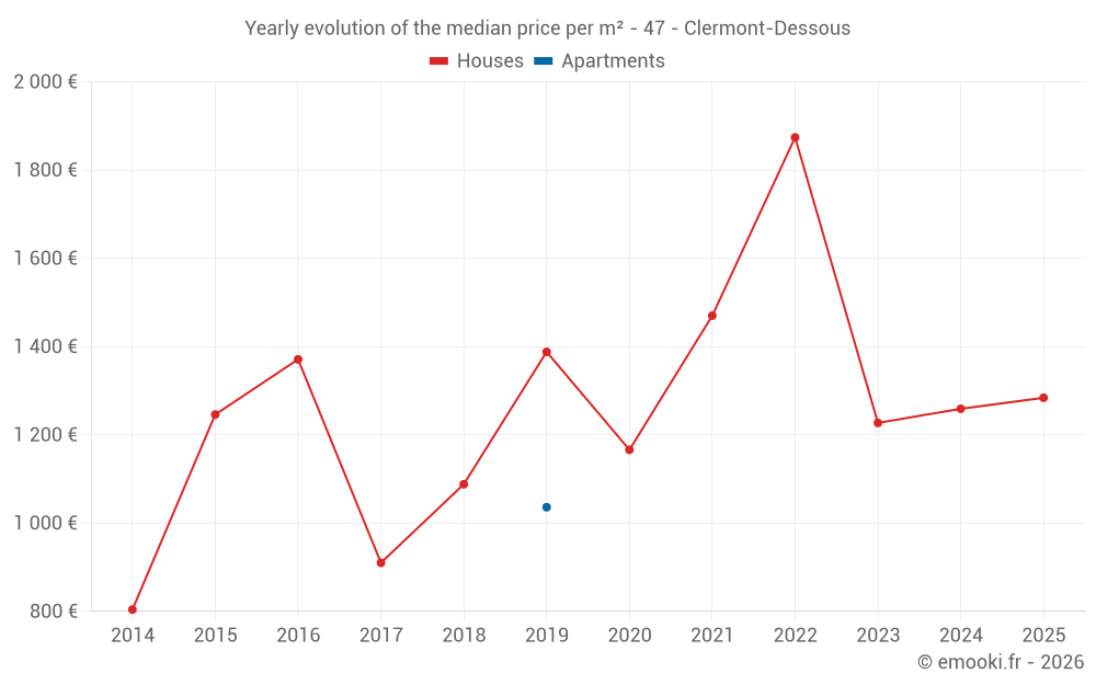 The median price on the 14 house transactions of the last 24 months in the municipality of Clermont-Dessous was 1 259 € per square meter for a median property value of 157 500 €. Over this period, 60% of transactions were between 821 and 1 642 € per square meter (from the 2nd to the 8th deciles).