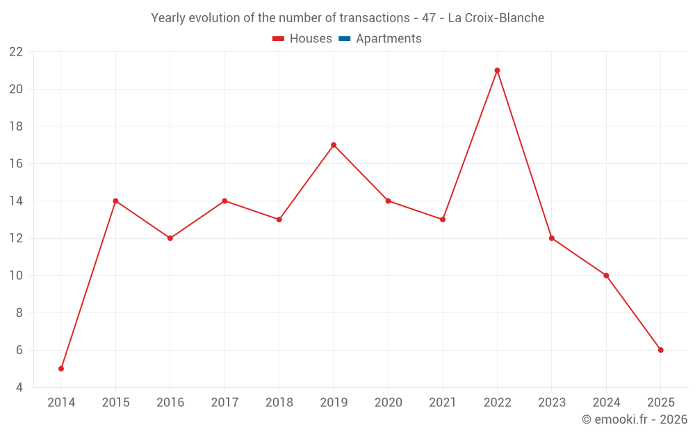 The median price on the 19 house transactions of the last 24 months in the municipality of La Croix-Blanche was 1 991 € per square meter for a median property value of 180 000 €. Over this period, 60% of transactions were between 1 365 and 2 420 € per square meter (from the 2nd to the 8th deciles).