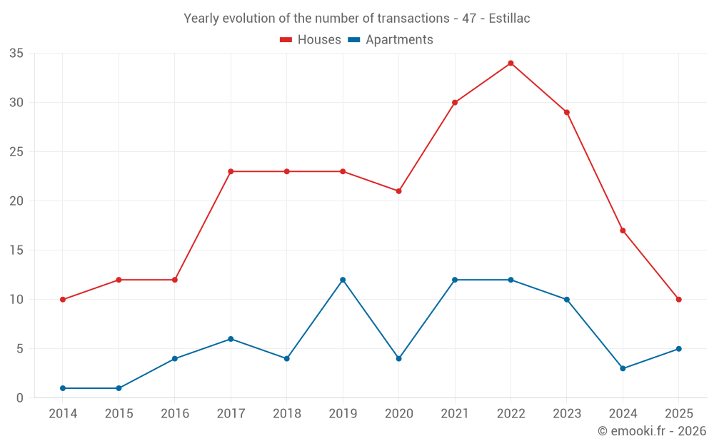 The median price on the 17 house transactions of the last 12 months in the municipality of Estillac was 2 406 € per square meter for a median property value of 240 000 €. Over this period, 60% of transactions were between 1 728 and 2 831 € per square meter (from the 2nd to the 8th deciles).