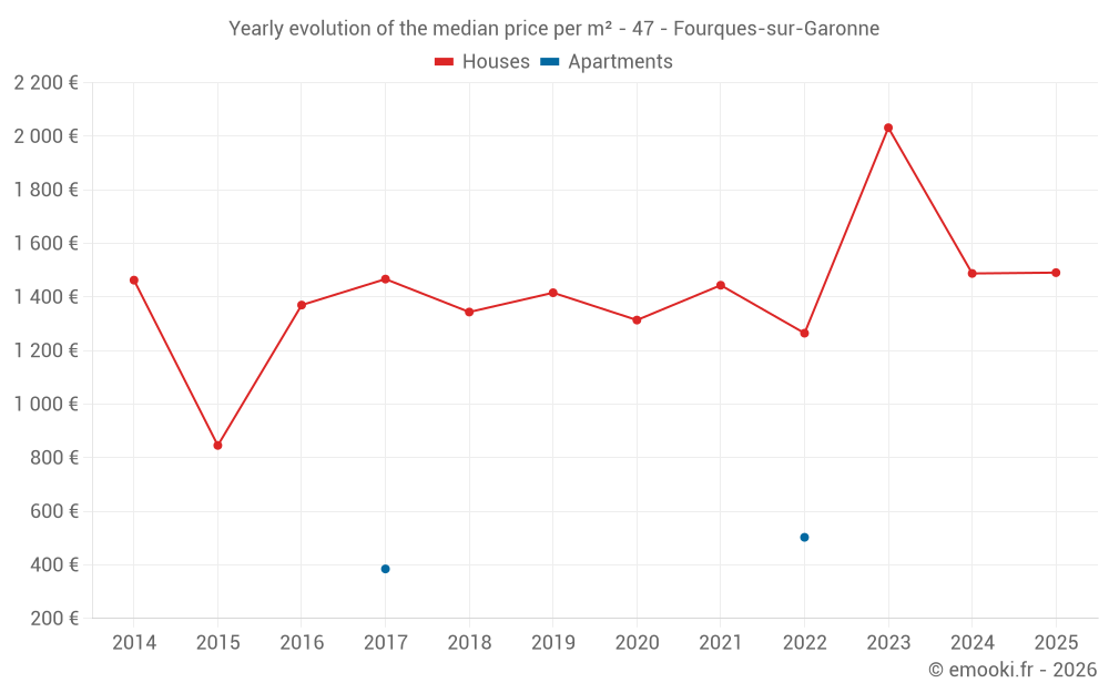 The median price on the 20 house transactions of the last 24 months in the municipality of Fourques-sur-Garonne was 1 554 € per square meter for a median property value of 137 500 €. Over this period, 60% of transactions were between 1 135 and 2 269 € per square meter (from the 2nd to the 8th deciles).