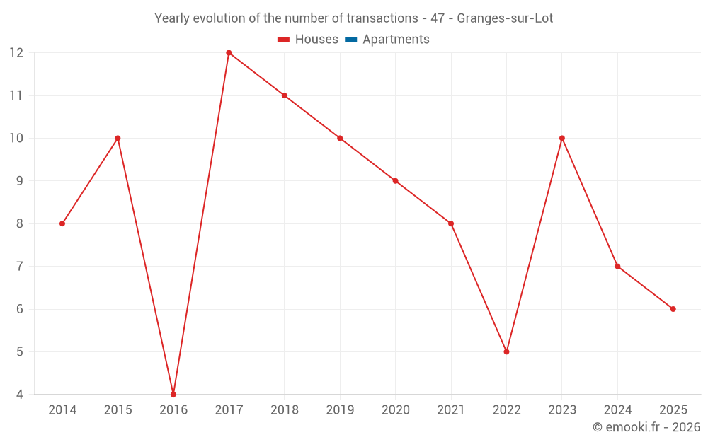 The median price on the 18 house transactions of the last 24 months in the municipality of Granges-sur-Lot was 1 207 € per square meter for a median property value of 125 100 €. Over this period, 60% of transactions were between 774 and 1 521 € per square meter (from the 2nd to the 8th deciles).