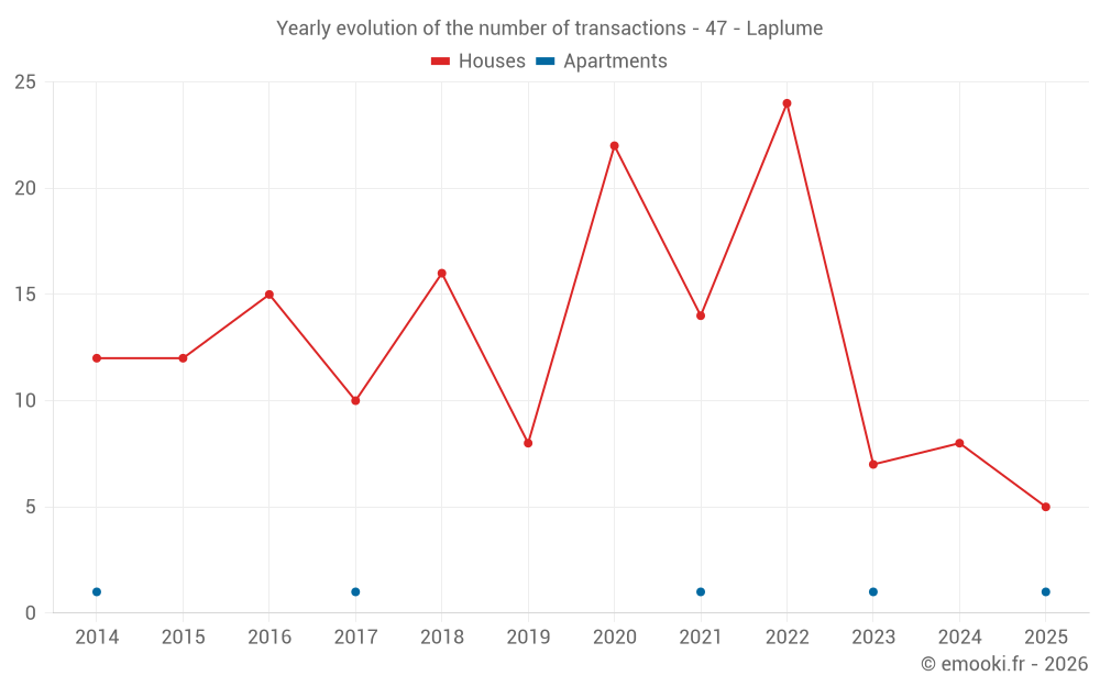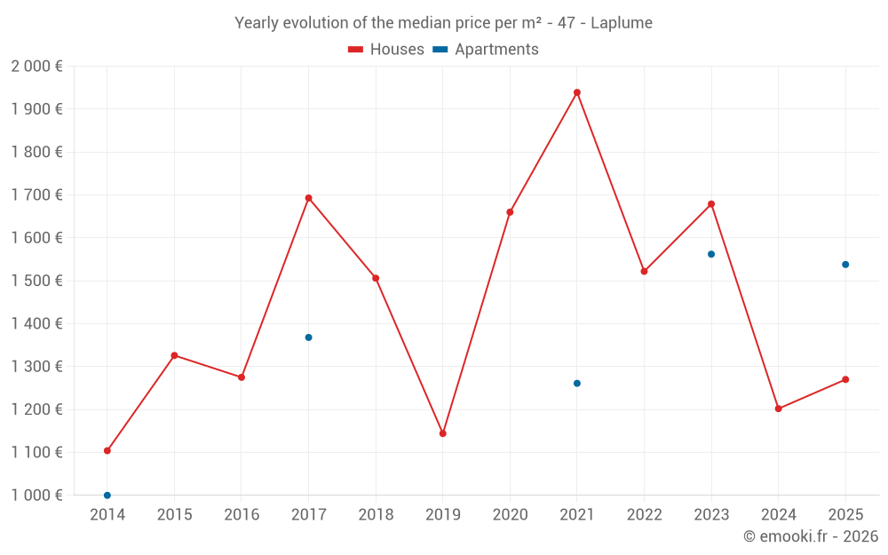 The median price on the 16 house transactions of the last 24 months in the municipality of Laplume was 1 406 € per square meter for a median property value of 155 000 €. Over this period, 60% of transactions were between 1 058 and 2 244 € per square meter (from the 2nd to the 8th deciles).