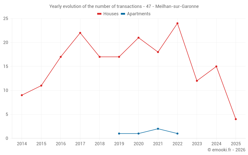 The median price on the 23 house transactions of the last 24 months in the municipality of Meilhan-sur-Garonne was 1 160 € per square meter for a median property value of 137 000 €. Over this period, 60% of transactions were between 503 and 1 830 € per square meter (from the 2nd to the 8th deciles).