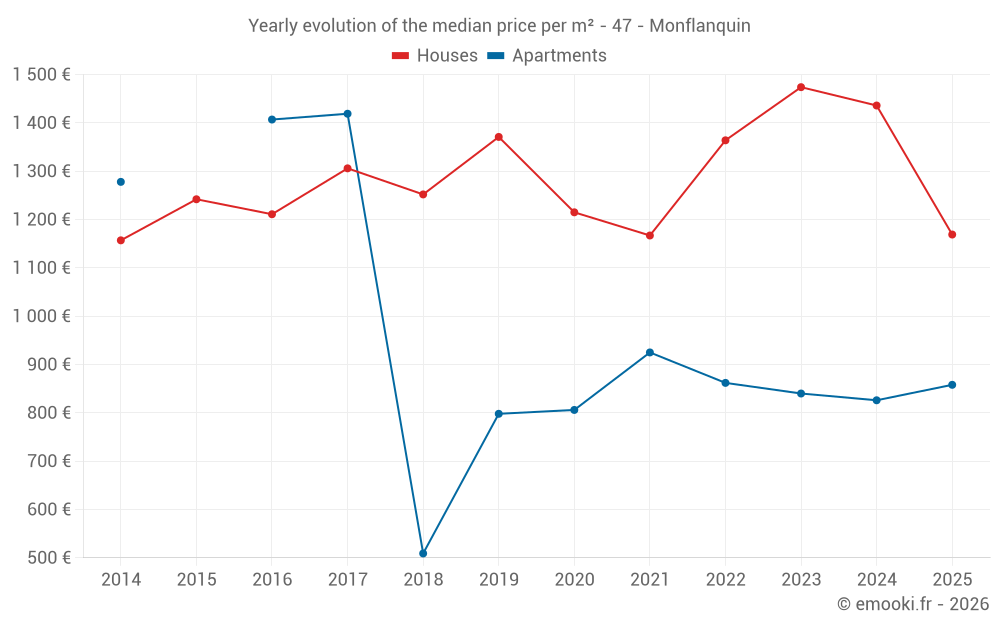 The median price on the 15 apartment transactions of the last 24 months in the municipality of Monflanquin was 839 € per square meter for a median property value of 26 600 €. Over this period, 60% of transactions were between 676 and 891 € per square meter (from the 2nd to the 8th deciles).