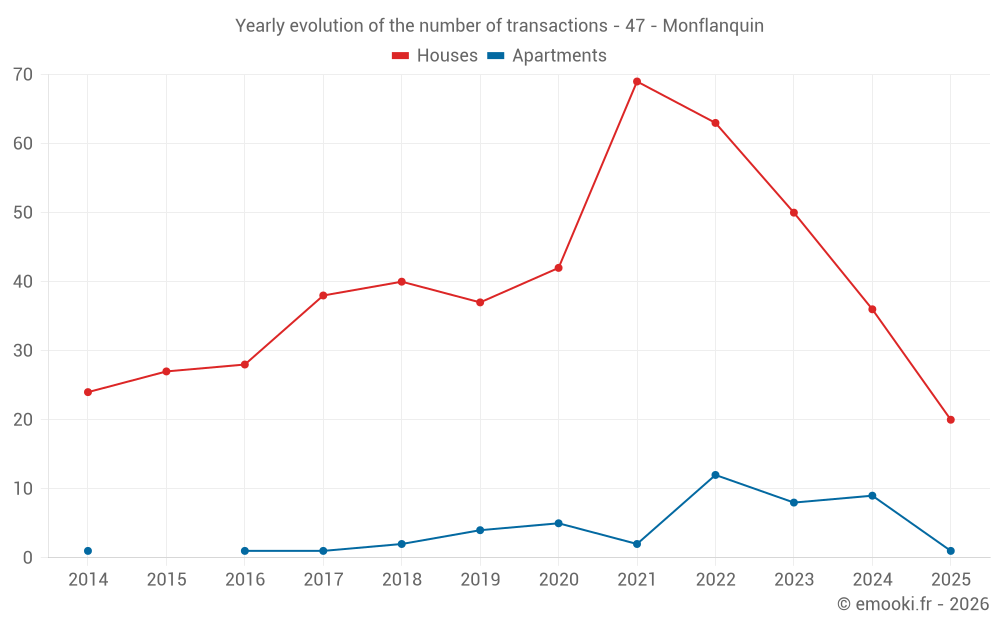 The median price on the 20 house transactions of the last 6 months in the municipality of Monflanquin was 1 169 € per square meter for a median property value of 122 407 €. Over this period, 60% of transactions were between 942 and 1 808 € per square meter (from the 2nd to the 8th deciles).