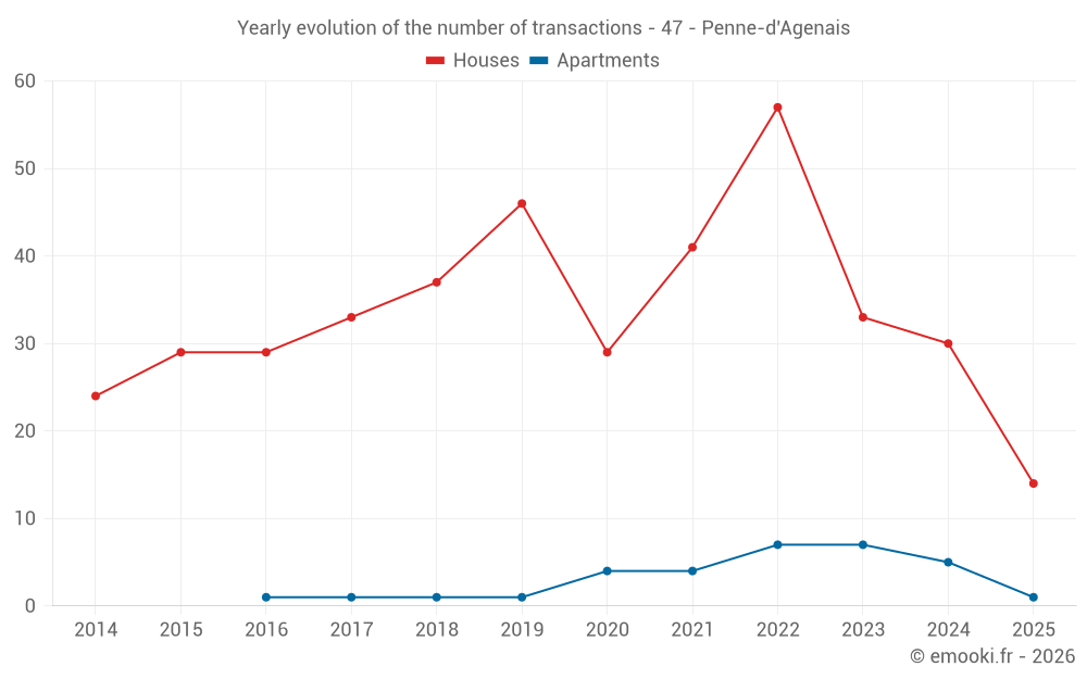 The median price on the 34 house transactions of the last 12 months in the municipality of Penne-d'Agenais was 1 882 € per square meter for a median property value of 195 000 €. Over this period, 60% of transactions were between 1 414 and 2 286 € per square meter (from the 2nd to the 8th deciles).