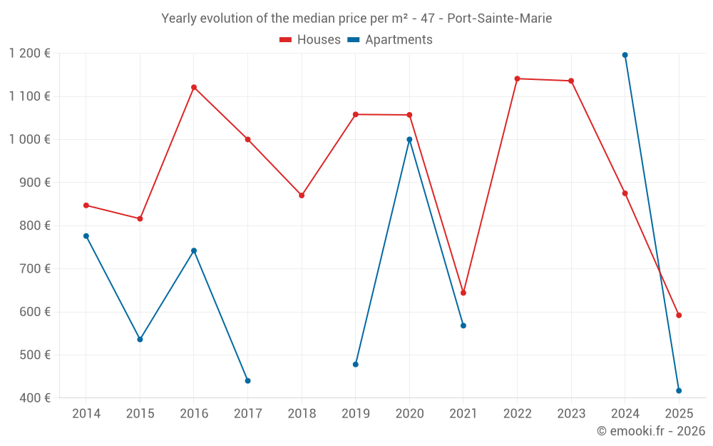 The median price on the 31 house transactions of the last 24 months in the municipality of Port-Sainte-Marie was 875 € per square meter for a median property value of 65 000 €. Over this period, 60% of transactions were between 335 and 1 369 € per square meter (from the 2nd to the 8th deciles).