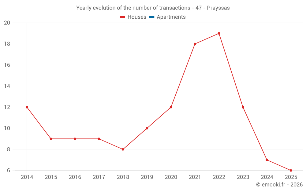 The median price on the 20 house transactions of the last 24 months in the municipality of Prayssas was 1 728 € per square meter for a median property value of 177 650 €. Over this period, 60% of transactions were between 935 and 2 018 € per square meter (from the 2nd to the 8th deciles).