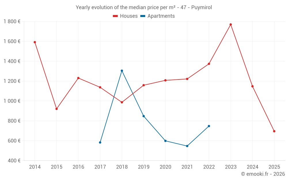 The median price on the 26 house transactions of the last 24 months in the municipality of Puymirol was 1 214 € per square meter for a median property value of 82 550 €. Over this period, 60% of transactions were between 655 and 1 842 € per square meter (from the 2nd to the 8th deciles).