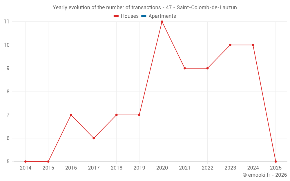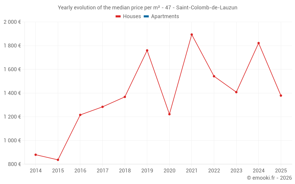 The median price on the 20 house transactions of the last 24 months in the municipality of Saint-Colomb-de-Lauzun was 1 667 € per square meter for a median property value of 142 500 €. Over this period, 60% of transactions were between 1 211 and 2 276 € per square meter (from the 2nd to the 8th deciles).