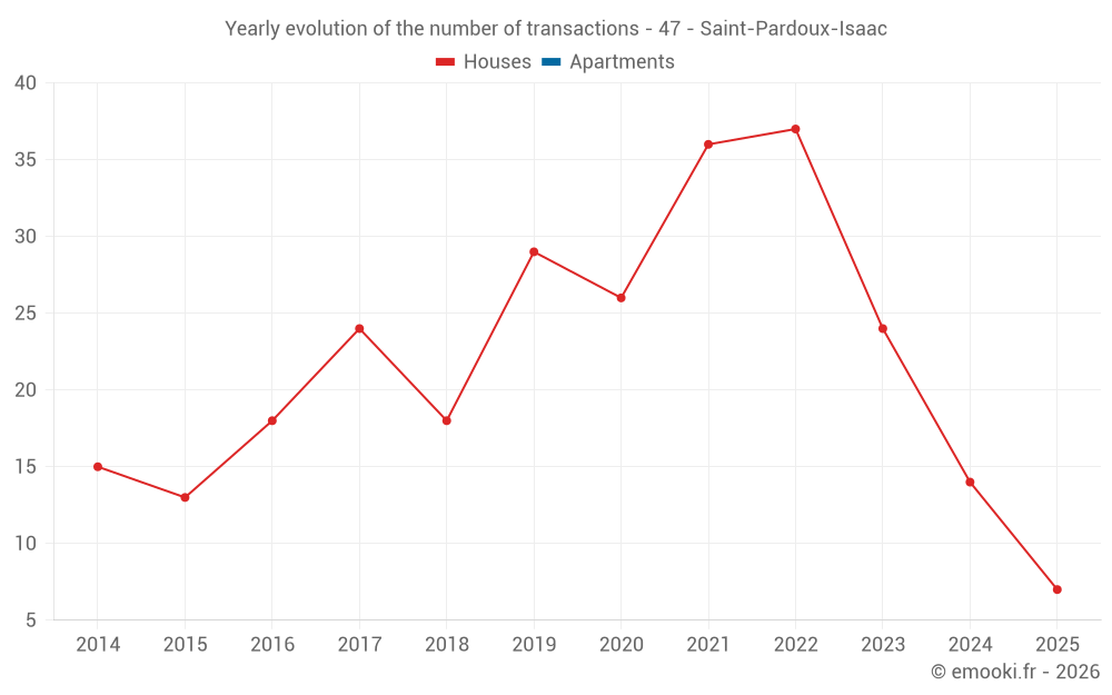 The median price on the 39 house transactions of the last 24 months in the municipality of Saint-Pardoux-Isaac was 1 469 € per square meter for a median property value of 123 500 €. Over this period, 60% of transactions were between 955 and 2 088 € per square meter (from the 2nd to the 8th deciles).