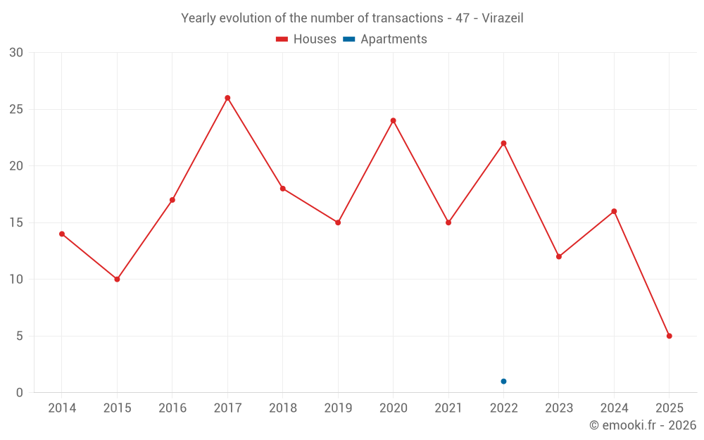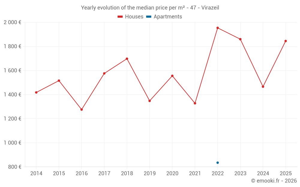 The median price on the 16 house transactions of the last 12 months in the municipality of Virazeil was 1 476 € per square meter for a median property value of 145 250 €. Over this period, 60% of transactions were between 1 000 and 2 047 € per square meter (from the 2nd to the 8th deciles).