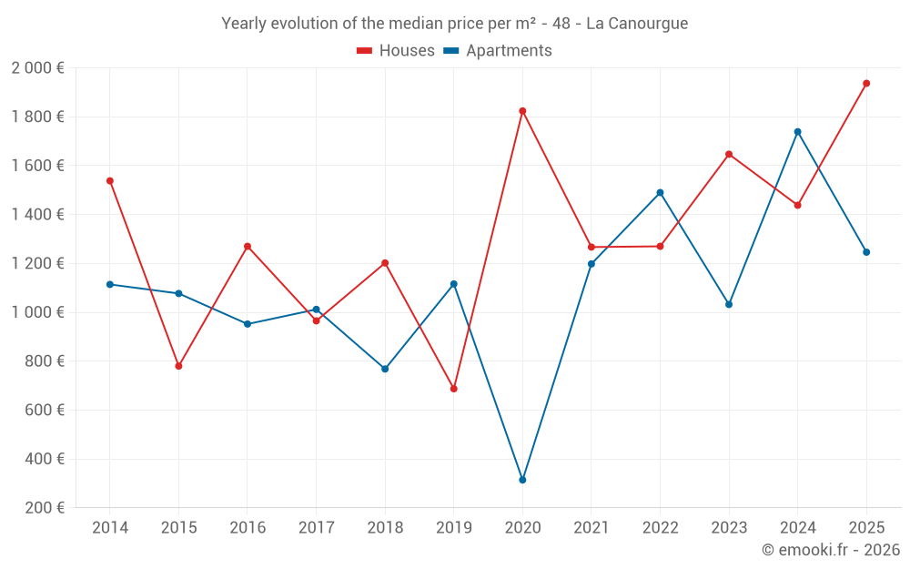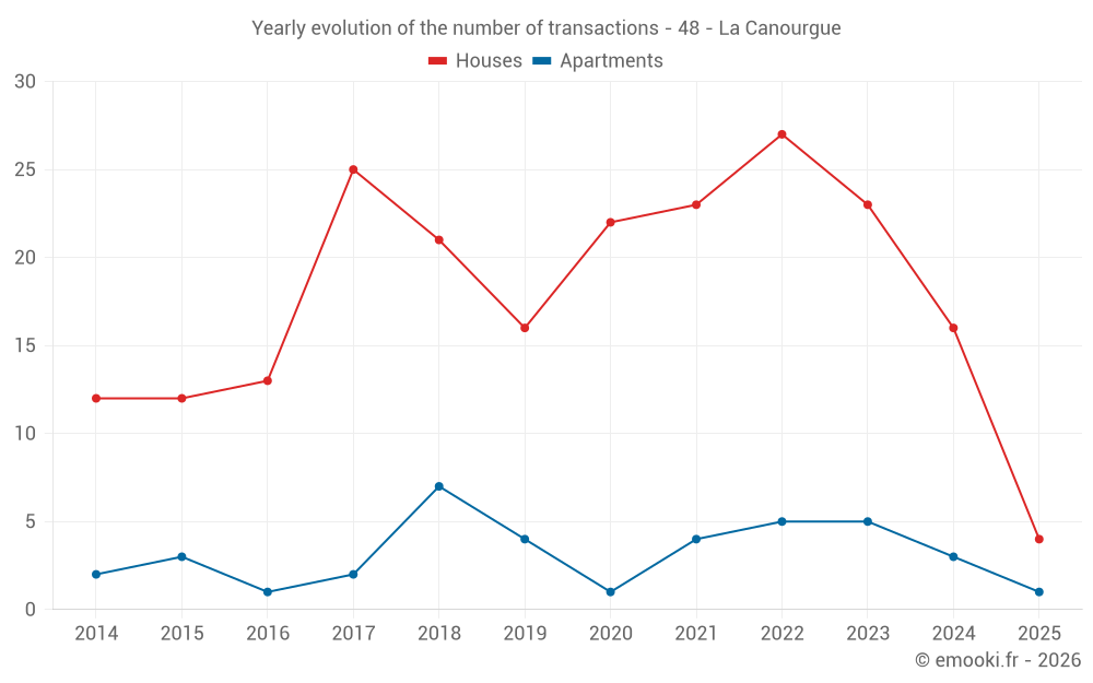 The median price on the 33 house transactions of the last 24 months in the municipality of La Canourgue was 1 646 € per square meter for a median property value of 119 000 €. Over this period, 60% of transactions were between 798 and 2 211 € per square meter (from the 2nd to the 8th deciles).