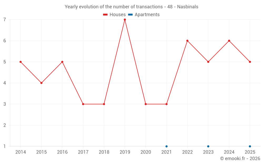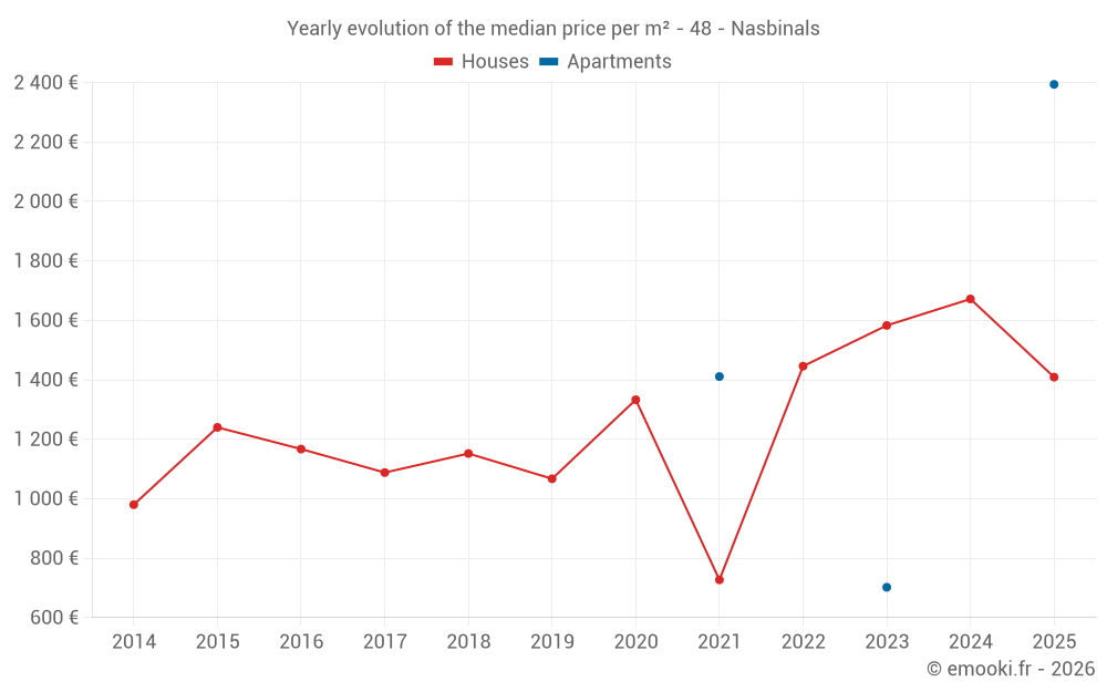 The median price on the 14 house transactions of the last 24 months in the municipality of Nasbinals was 1 330 € per square meter for a median property value of 87 500 €. Over this period, 60% of transactions were between 626 and 2 317 € per square meter (from the 2nd to the 8th deciles).