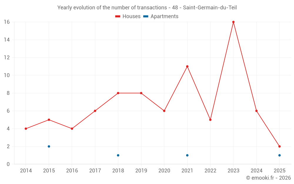 The median price on the 16 house transactions of the last 24 months in the municipality of Saint-Germain-du-Teil was 1 242 € per square meter for a median property value of 121 013 €. Over this period, 60% of transactions were between 530 and 1 574 € per square meter (from the 2nd to the 8th deciles).