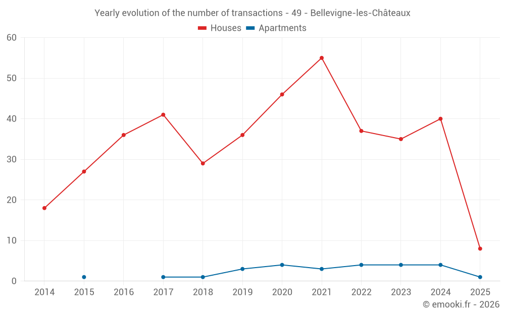 The median price on the 30 house transactions of the last 12 months in the municipality of Bellevigne-les-Châteaux was 1 494 € per square meter for a median property value of 142 500 €. Over this period, 60% of transactions were between 1 019 and 1 884 € per square meter (from the 2nd to the 8th deciles).