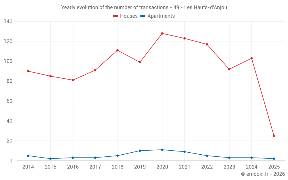 The median price on the 25 house transactions of the last 6 months in the municipality of Les Hauts-d'Anjou was 1 593 € per square meter for a median property value of 180 000 €. Over this period, 60% of transactions were between 968 and 2 168 € per square meter (from the 2nd to the 8th deciles).