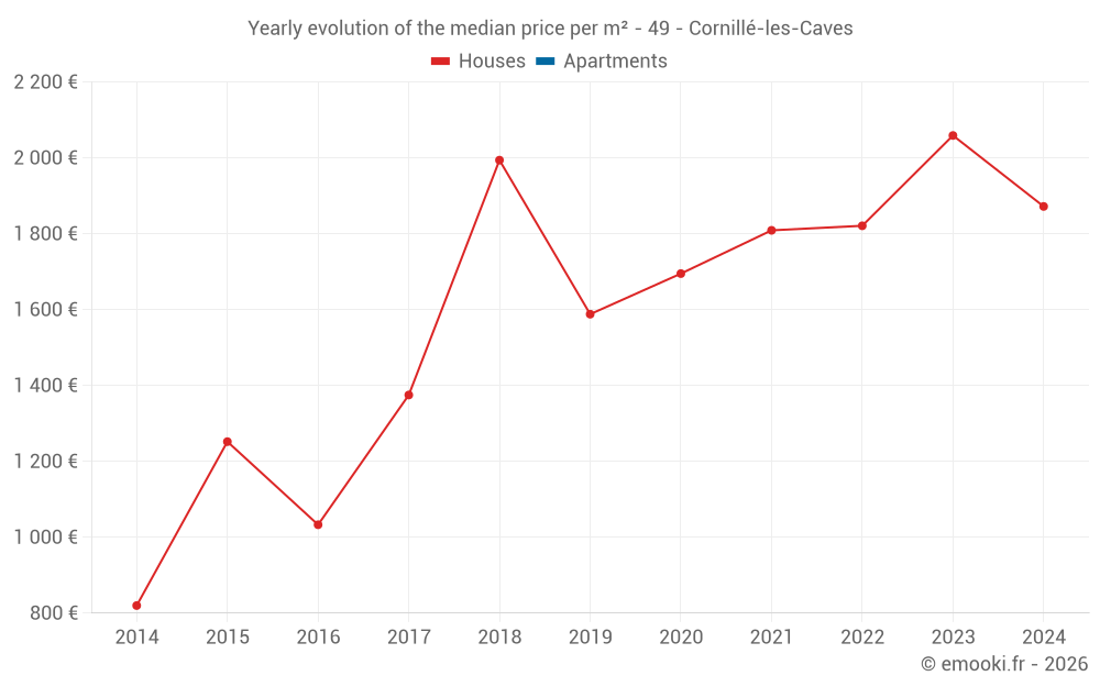 The median price on the 16 house transactions of the last 24 months in the municipality of Cornillé-les-Caves was 1 930 € per square meter for a median property value of 242 750 €. Over this period, 60% of transactions were between 1 782 and 2 536 € per square meter (from the 2nd to the 8th deciles).