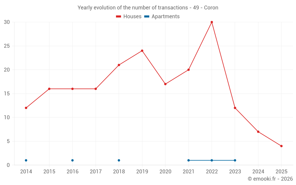 The median price on the 14 house transactions of the last 24 months in the municipality of Coron was 1 538 € per square meter for a median property value of 115 745 €. Over this period, 60% of transactions were between 1 034 and 1 925 € per square meter (from the 2nd to the 8th deciles).