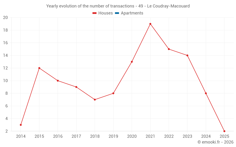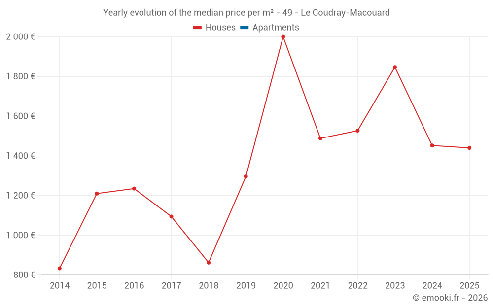 The median price on the 16 house transactions of the last 24 months in the municipality of Le Coudray-Macouard was 1 768 € per square meter for a median property value of 157 500 €. Over this period, 60% of transactions were between 1 111 and 2 059 € per square meter (from the 2nd to the 8th deciles).