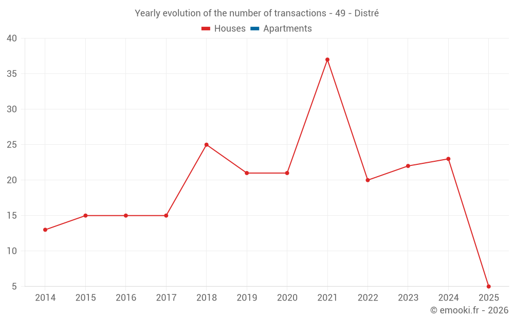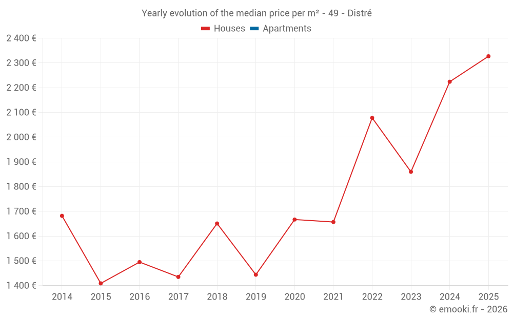 The median price on the 40 house transactions of the last 24 months in the municipality of Distré was 2 239 € per square meter for a median property value of 238 500 €. Over this period, 60% of transactions were between 1 609 and 2 732 € per square meter (from the 2nd to the 8th deciles).