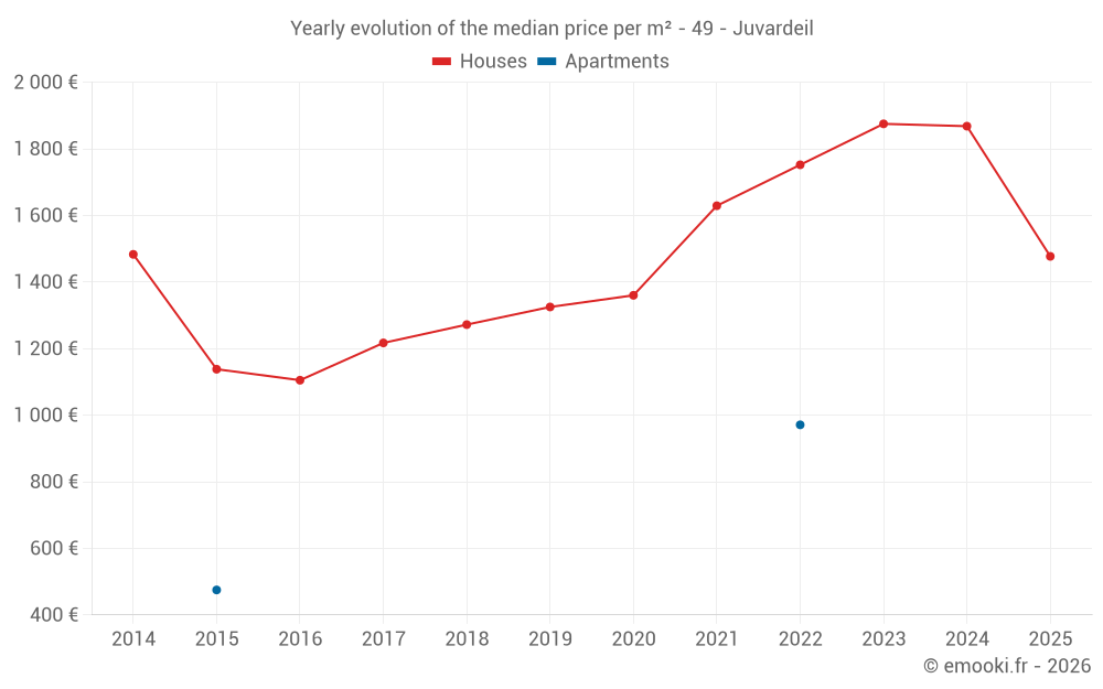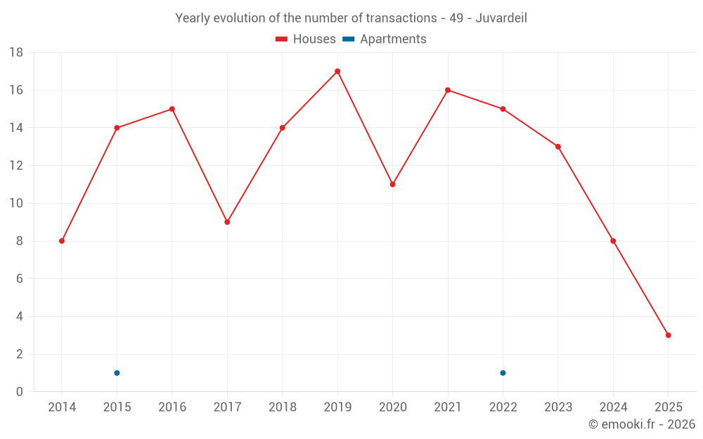 The median price on the 18 house transactions of the last 24 months in the municipality of Juvardeil was 1 760 € per square meter for a median property value of 177 500 €. Over this period, 60% of transactions were between 1 453 and 2 517 € per square meter (from the 2nd to the 8th deciles).
